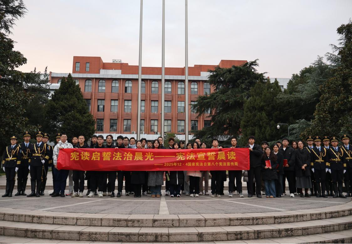 1247时,宪法宣誓晨读活动在东校区郭沫若广场庄严举行,伴随着庄严的国歌和校歌声,国旗、中国科学院院旗和中国科大校旗冉冉升起。在场师生手持宪法读本,面向国旗庄严宣誓。铿锵有力的誓言穿透寒风,在晨光中久久回荡。随后的宪法序言集体诵读环节,琅琅书声与初升的朝阳相映交织,宪法精神如破晓之光,照进师生心底。