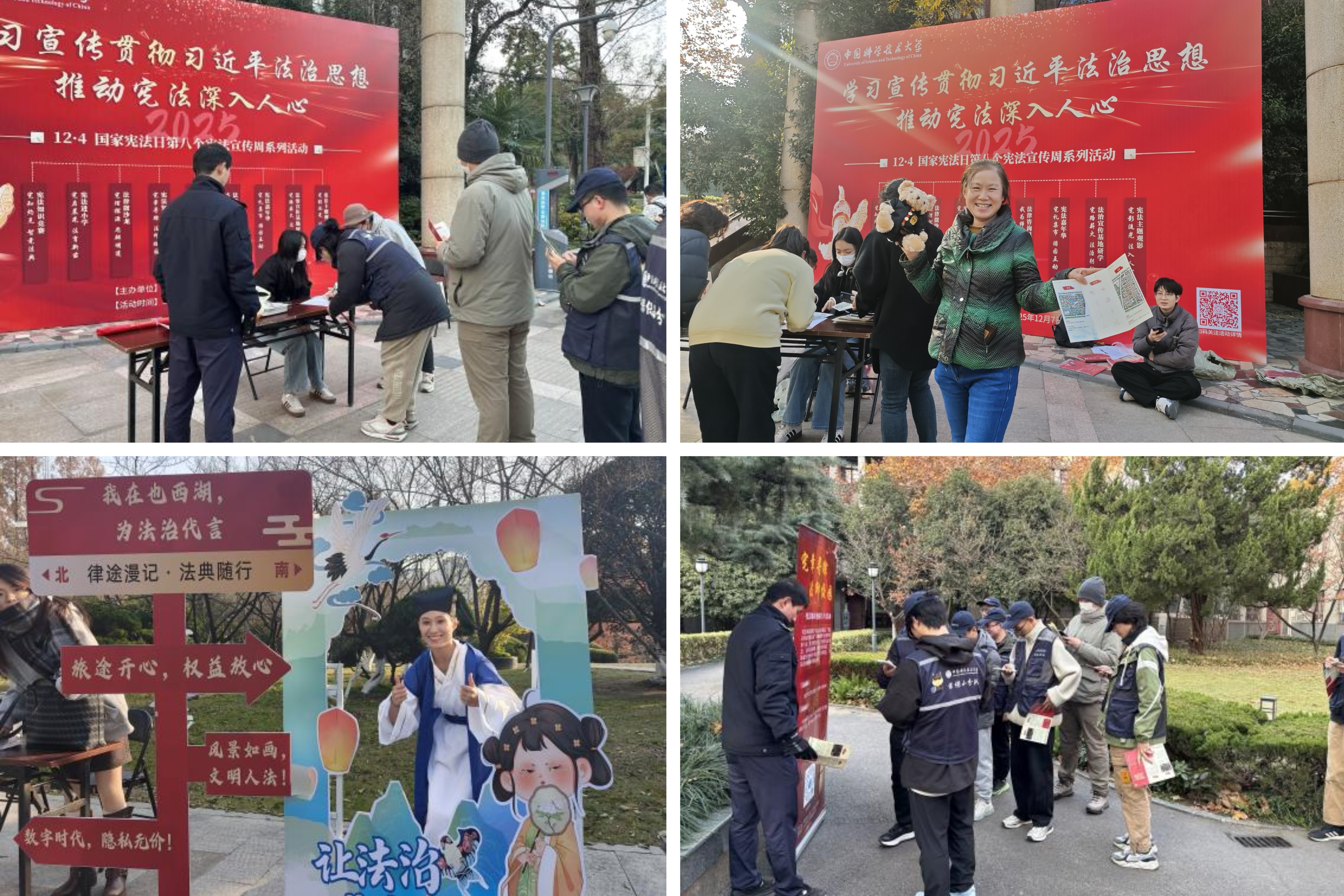 123日,“宪章寻踪,法印校园”宪法知识打卡活动在东、西校区同步举行。活动设置多个各具特色的打卡点,师生在校史馆前、郭沫若广场、第二教学楼、也西湖畔等地点进行打卡并参与答题、诵读、猜题等活动,在校园探索中学习宪法知识。师生们手持集章册漫步校园,在互动体验中增进对宪法的理解,并将宪法知识转化为校园记忆与法治文化积淀。