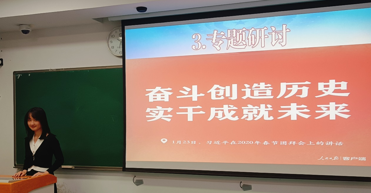 活动在团支部副书记彭思雨晨同学精彩的开篇导学中拉开帷幕。她系统梳理了习近平新时代中国特色社会主义思想的主要内容,阐述了“学思践悟新思想”与“知行合一担使命”两者间内在的逻辑一致性。