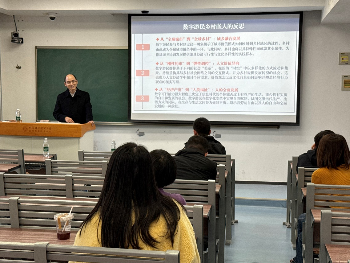 报告逻辑严谨、阐释精当,不仅深化了师生对数字时代城乡融合规律的理解,更为乡村振兴研究与实践贡献了全新视角。现场互动气氛热烈,大家围绕数字游民的政策支持体系、差异化引导策略及城乡要素双向流动机制等问题踊跃提问。王忠教授结合其研究内容,对这些问题予以细致解答。与会师生纷纷表示收获丰硕,认为讲座内容极具启发性,对未来的学习与研究具有重要指导价值。